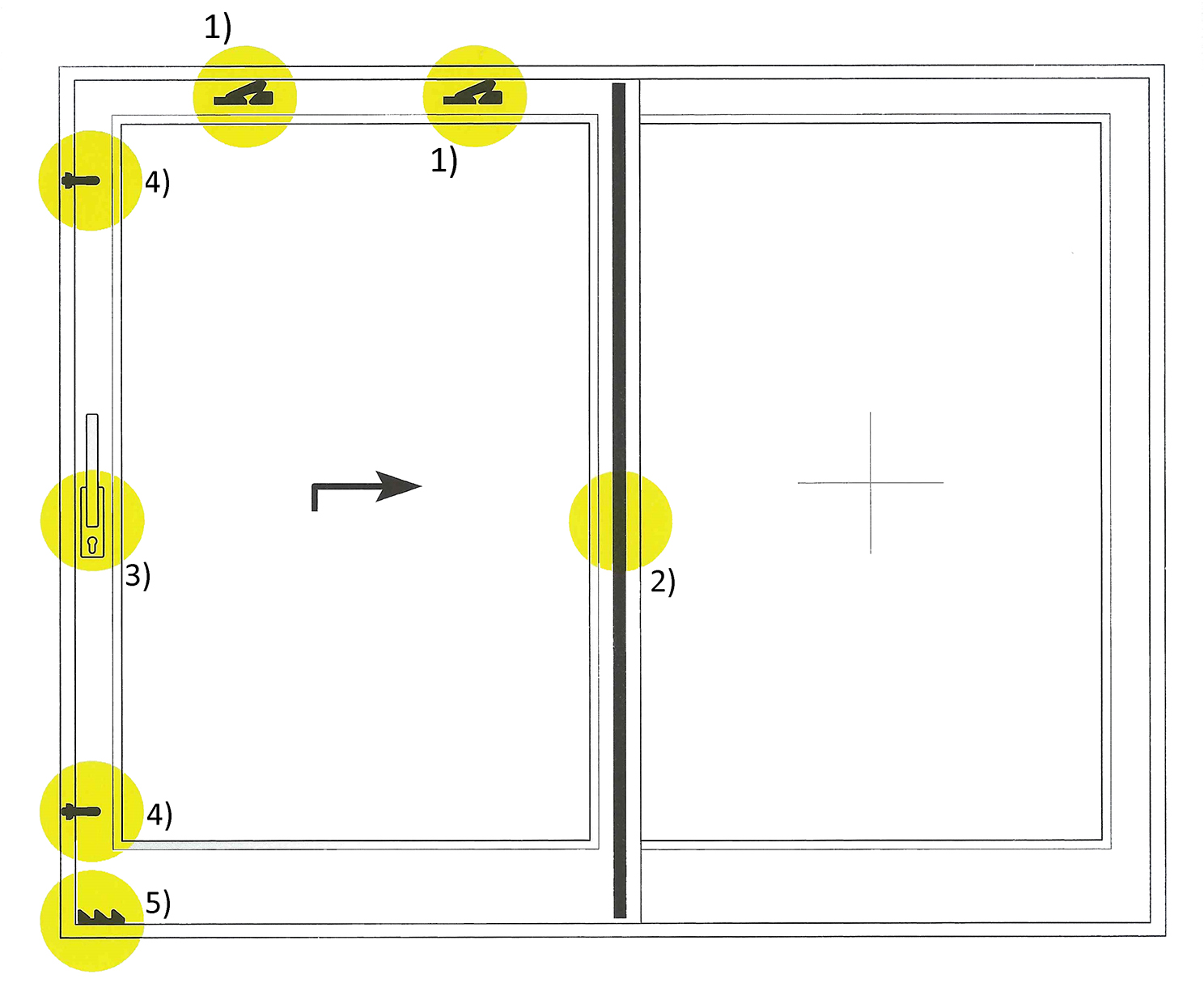 Hebeschiebe-Elemente haben durch ihre kompakte Bauweise und stabilen Beschläge generell eine einbruchhemmende Wirkung. Zusätzlich werden sie mit Sicherheitsbeschlagsteilen erweitert, die in nachfolgender Abbildung in gelb markiert sind.