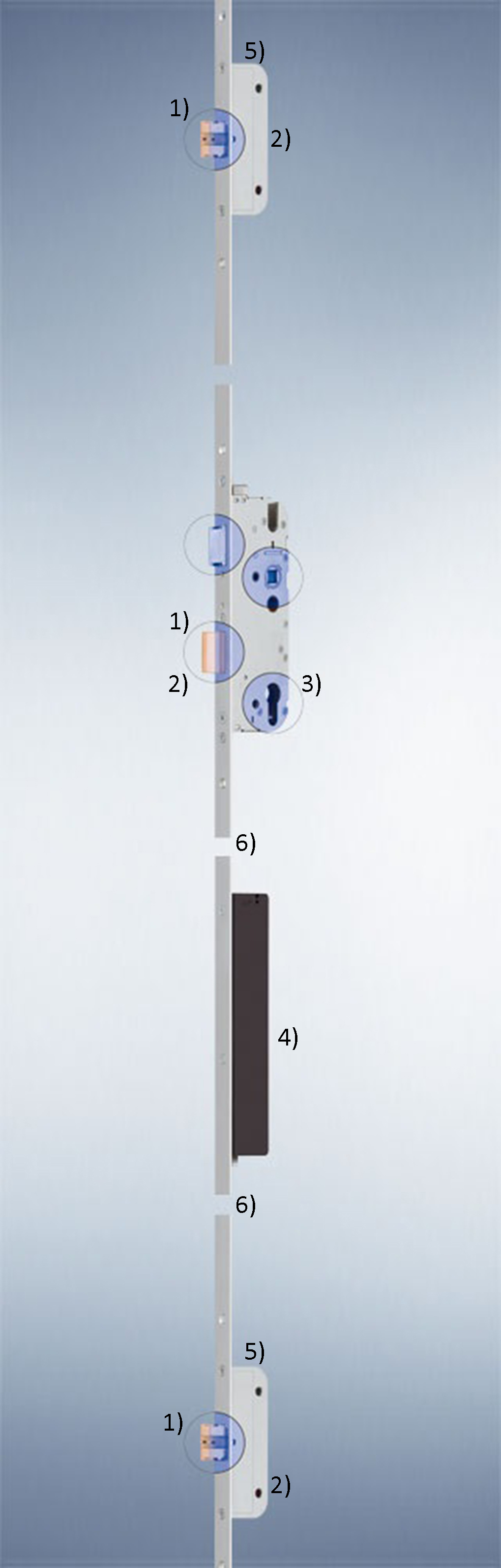 Insgesamt werden serienmäßig ab Werk bei sämtlichen Intraform-Hauseingangstüren 3-fach automatische Fallenriegel verbaut: In dem oberen Drittel (im Bild links zu sehen), bei etwa der Hälfte integriert mit der Schlossanlage (im Bild mittig zu sehen) und in dem unteren Drittel (im Bild rechts zu sehen).